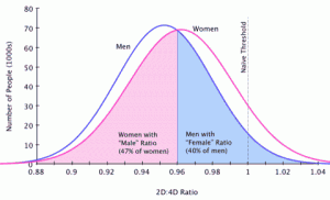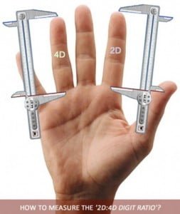 Bărbații cu trăsături mai feminine, precum și homosexualii, au un indice 2D:4D crescut, asemănător cu cel al femeilor. Eu chiar am avut curiozitatea să-mi iau propriile măsuri și am găsit un indice foarte mic (foarte masculin), mai exact 72/80 = 0,9. Nu e de mirare că am fost bun la științe și sport, la pământ ca socializare și empatie, dar pofticios nevoie mare la fuste. Un soi de Casanova, ce mai! 😆